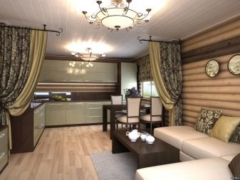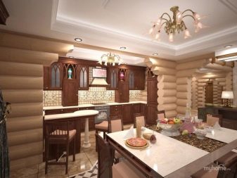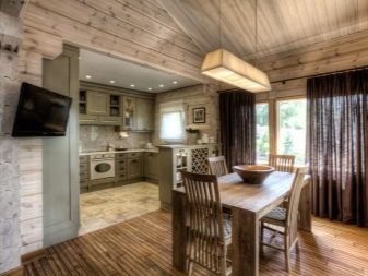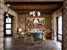 - An interesting idea of designing a kitchen-dining room in a log house. Lightened walls visually add height to the room. Tiled floors in beige tones harmoniously with the overall design concept. The stylish black-and-white headset looks interesting and relevant in such a frame.
