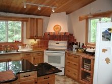 In the interior of a wooden house, the main subject of household appliances is the hood - the most powerful, with mandatory forced air exchange.