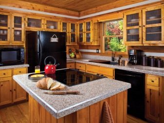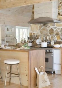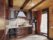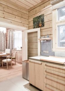 The interior decoration of the kitchen in a wooden house must comply with the general concept of suburban housing, be unobtrusive and at the same time comfortable to use and care. Do not use artificial materials that completely level the meaning of building housing from logs and beams.