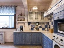 - Cozy rustic cuisine in eco style. The design of a complex configuration room is helped by the allocation of separate zones inside it for eating, storage and cooking. The rich blue color of the sideboard against the background of a wall made of timber looks fresh and original. The U-shaped set with a breakfast bar leaves you feeling spacious even in a small kitchen.
