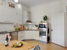 White color works well in a small kitchen - furniture in this tone can be used as an element of zoning to separate the dining room group from the headset. The cabinets in the kitchen are made simple, wooden.