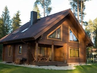 Traditional rustic style with chopped log walls - they are left in their natural form, covered with a matte colorless varnish. Solid furniture set of solid wood also retains its pristine beauty. The floor of the cork or shipboard is light or tinted.
