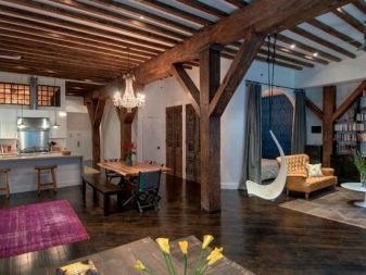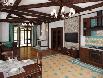If you want to maintain authenticity, the ceiling is painted in bright colors, and massive beams are tinted in dark shades.