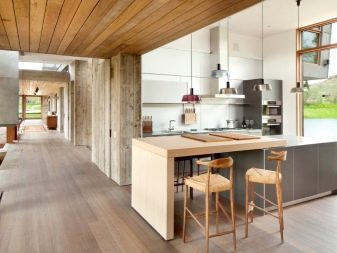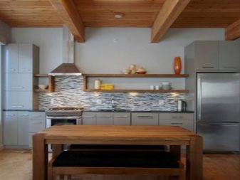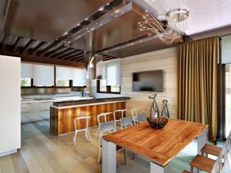 In the modern design of the kitchen, the use of suspended and tension structures is permissible. The first are made of drywall, they can be multi-level, with wood trim and other textures. In such boxes in a wooden house, wiring, ventilation and communication pipes are often laid, hiding the modern "stuffing" of the building from prying eyes.