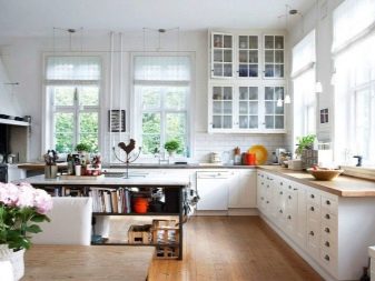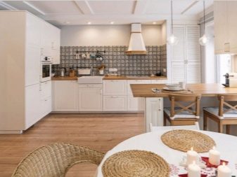 It is characterized by spaciousness, lightness, laconicism of the color palette. Walls can preserve the natural shade of wood, but most often they, like the set, are painted in bright colors. The kitchen is usually combined with the dining room, highlighting the dining and working areas, it is possible to create a combination with a transition to the living room - like in a studio.