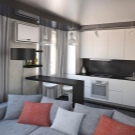 An original idea with a separate gray kitchen. Partitions of drywall will create the effect of a separate space, and a small partition-rack will replace the dining table.