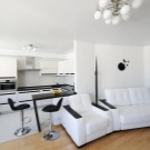 The snow-white interior with a direct kitchen beautifully complements the wooden table, it also divides the room into zones. Transparent plastic chairs make the interior lighter, while original chandeliers and a picture make the interior more stylish.