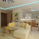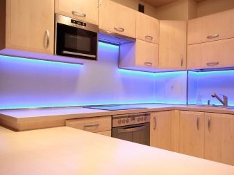 To visually increase the height of the ceiling, you can use the lighting along the ceiling line or integrate lights under the kitchen. However, the tape looks better with a kitchen set in which household appliances are built.