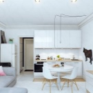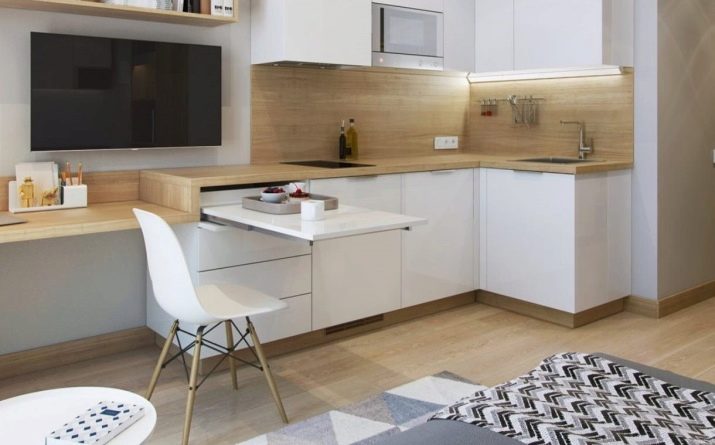 The snow-white kitchen-bedroom with built-in appliances and a pull-out table is an excellent youth solution. A wooden apron and countertop will be a beautiful accent.