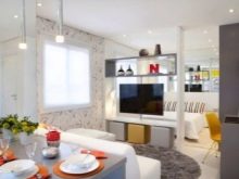 - To focus on the living room and divert attention from the kitchen, you should purchase a kitchen set in a neutral color. It is better to minimize the use of bright accents and textures in the kitchen area, and increase their number in the living room.