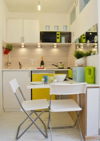 - Folding table. This option is often used when there are no clear boundaries dividing the studio into zones. It does not take up space in a small room. Folding tables can turn into a regular wall panel or can be part of a kitchen set, which will make them invisible when folded.