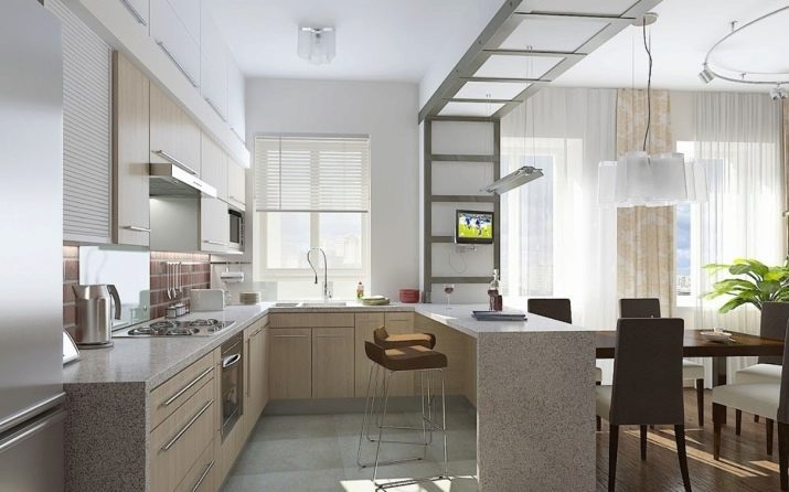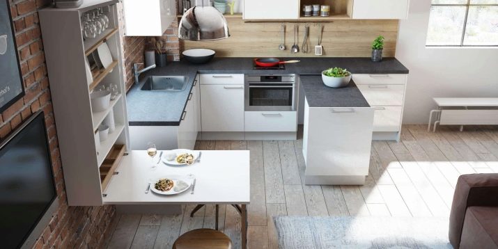 The second most popular model is the U-shaped kitchen. As a rule, one of the sides is created without upper cabinets. It is this side that visually divides the studio space. You can also use the bar counter instead of kitchen cabinets, which will replace the table in a small kitchen.