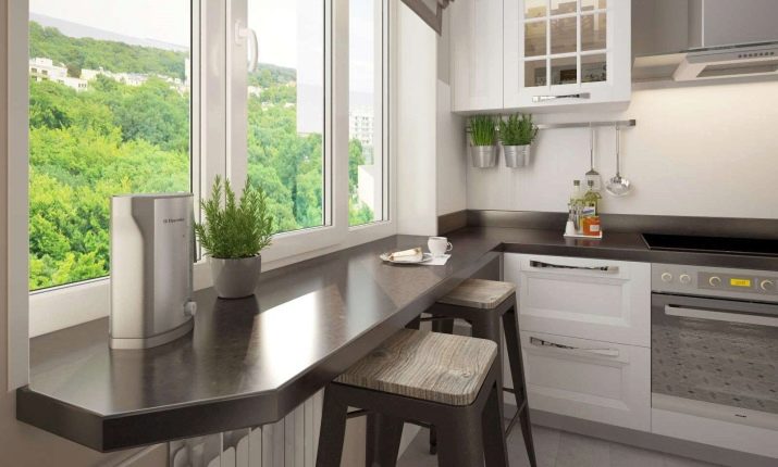 - Windowsill. It is easy to make an excellent dining table from a wide windowsill. And if in your kitchen it is not wide enough, you can expand it. This is a great option, because you maximize the use of the entire surface in the kitchen. This option is more suitable for young people.