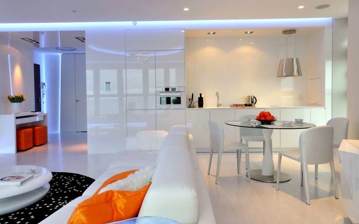 Lighting is responsible for mood, comfort, as well as for the beauty and brightness of the room. Studios are characterized by the use of lamps to denote different areas of the room. And in order to make the cooking process more convenient, a light strip or several small bulbs are installed in the kitchen. You can illuminate the area where the hob is located with a glass insert.