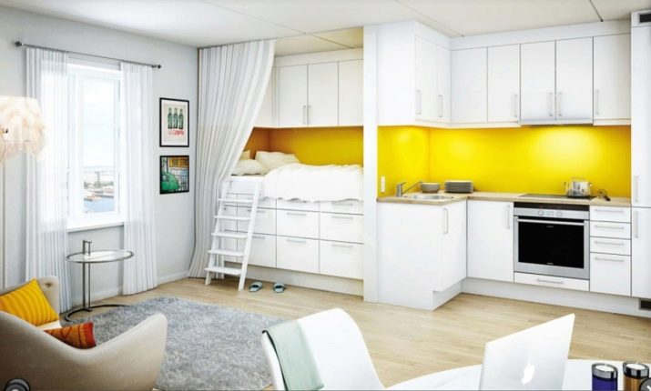 An interesting solution for combining the kitchen, living room and bedroom. The whole design is made in white, which visually increases the room. And the yellow wall in the bedroom and kitchen area makes it more expressive.