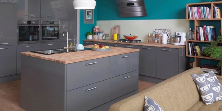 A gray direct kitchen with a wooden countertop looks gentle and calm, blends nicely with a bright blue wall.