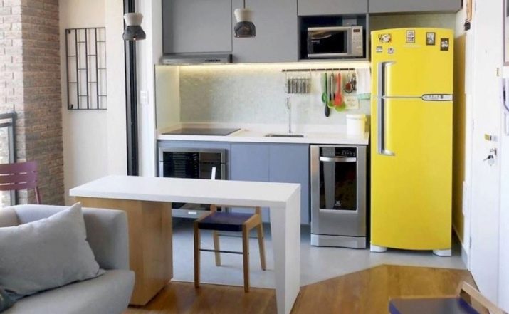 The gray kitchen unit blends nicely with a bright yellow fridge. And the separation of space is carried out using a snow-white wooden table.