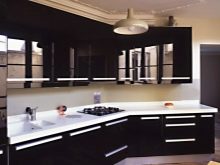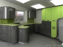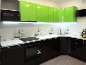 - Kitchen sets that combine 3 different colors at once look interesting. For example, it may be an unusual combination of black, white and grass green shades. A corner kit with rounded surfaces, in which the lower cabinets will be black and the upper ones in green, is the perfect complement to the modern style. Countertops are best chosen in pure white, and the facades are glossy.