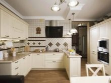 Corner kitchen sets are also represented by chic U-shaped sets. Such options look solid and expensive. They have a large number of work surfaces, cabinets and drawers for storing all the necessary kitchen utensils. The U-shaped kitchen allows you to delimit the cooking area so that the rest of the environment is not involved.