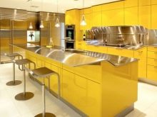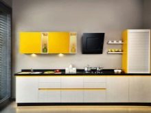 - Bright and positive set with glossy yellow facades and chrome fittings Perfectly fits in a room with a snow-white finish. Countertops are better to choose light. A dark glass table with white laconic chairs will look nearby.