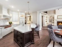 - Chic island kitchen with wooden facadescomplemented by a black horizontal strip, it will look gorgeous if it is supplemented with white upper cabinets, dark countertops, and the island is equipped with a glass work surface. The ensemble will be even more chic if you add it with built-in appliances with shiny, silver surfaces. Finishing in such a room is better to choose bright or snow-white.