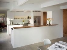 In a stylish, fashionable and rich kitchen, a peninsular type headset will look good. The indicated type of layout is a special kind of cuisine with an island. In this case, the central part is end-mounted against the wall, forming a kind of protrusion, which can be used as a working area, separated from the dining room.