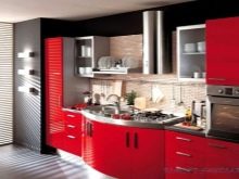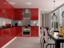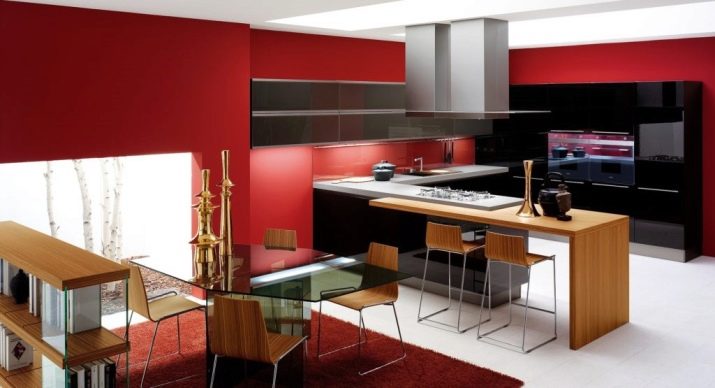 - Black glossy headsetequipped with modern built-in appliances will look spectacular against the background of red walls and white floors and ceilings. A similar set will resonate with a wooden worktop and a glass dining table.