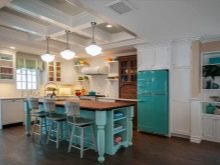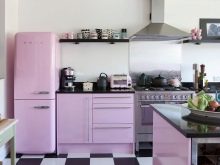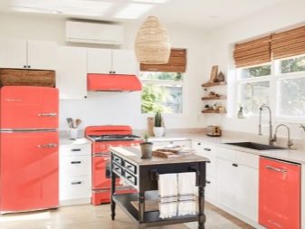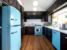 - Retro style headset. A cool and interesting kitchen will turn out if you introduce a retro style headset. The cabinets and drawers themselves in such sets can be concise, with neutral colors, but they will be amazingly complemented by pieces of equipment that are distinguished by rich colors: red, blue, blue.