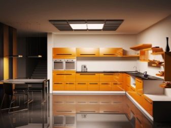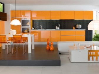 - In a spacious room, an angular semi-glossy orange-colored headset will look great. He will sparkle with new colors, if you add it with black and white countertops. Ideal metal shiny hardware. Against the background of such chic furniture, you can resort to white walls and ceilings, and the floor is decorated with glossy gray materials.