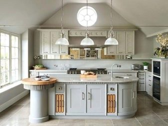 - Radius constructions. Stylish and spectacular in the kitchen will look like a set with rounded facades. This type of furniture looks especially impressive in modern or glamorous environments. These kits, complemented by metal parts and frosted glass, fit perfectly into modern interiors.