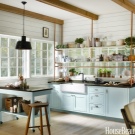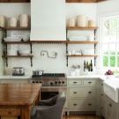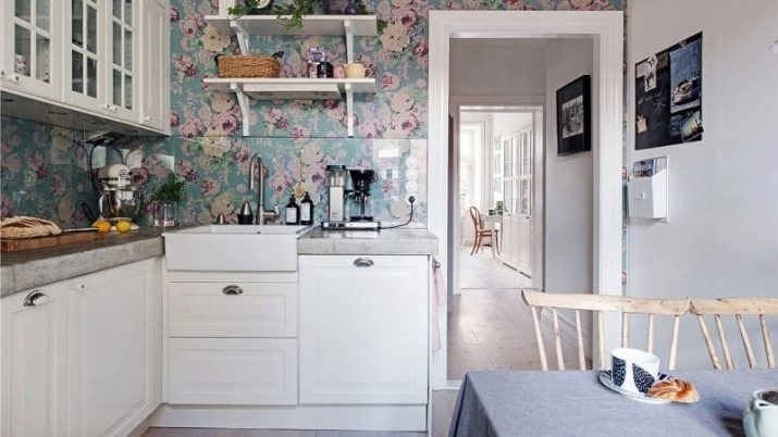 In modern kitchens, even small ones, any ideas can be realized. The main thing is to turn on imagination and use all the free space to the maximum. This option is perfect for a country-style kitchen. A white headset will look great on a background of floral wallpaper. In addition, small additions in the form of small items placed on additional shelves will make the room much more comfortable.