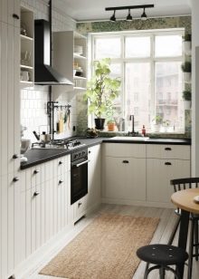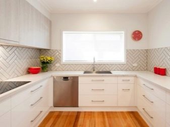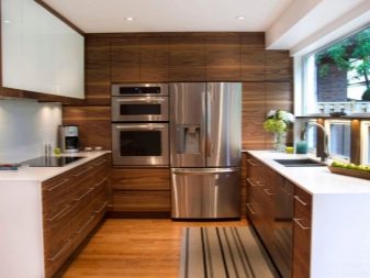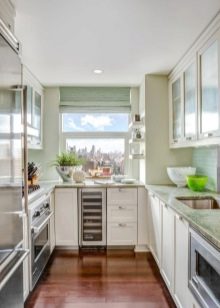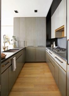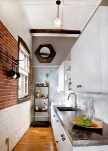 Having chosen this placement option, it is necessary to determine in which corner of the room the kitchen set will be installed. The furniture that is used in this case is almost always compact and not too bulky. In small kitchens, do not install more than three cabinets. Most often, in the middle of the room is a single-section sink, and on both sides of it there are headset elements. It is good if the cabinets are not equipped with hinged doors, but sliding. A very convenient option is when the two lower stands are joined by a countertop. Most often, built-in appliances are placed in the formed niche.