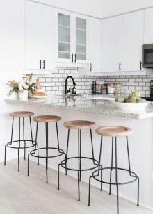 If the kitchen is very small, all the pieces of furniture can be arranged in one row. Here, cabinets and cutting tables fit perfectly. In this case, there is a lot of space for the dining area. It can consist of a table and a small sofa. This is the most convenient option. Furniture in a small kitchen can be placed in many ways.