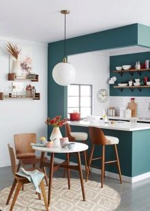 - Large and bulky models should be avoided. It is worth paying attention to a set with a bar counter or buy a kitchen under the ceiling. But large dining tables are best not to purchase. In addition, it is important that all items in the kitchen do not interfere with free movement.