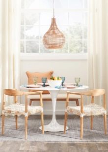 When the work area is fully organized, you can arrange a place where the whole family will gather. The simplest solution is setting up a small coffee table and a pair of chairs. It is best to place them near the window. This is the brightest and most comfortable place. The table itself may have an oval or round shape.