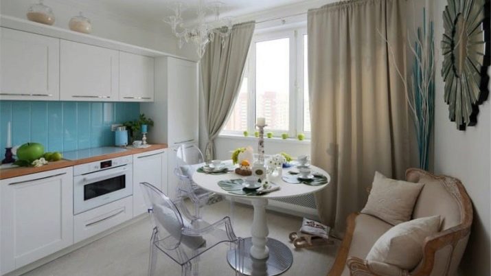 You can turn a window sill into a convenient table, thereby saving a little space. In addition, in small kitchens you can buy a ready-made set with a bar. It does not take up much space. In this case, classic chairs can be replaced with bar stools. And if the choice is made in favor of a regular table, you can purchase a small sofa with built-in compartments for storing small kitchen utensils.