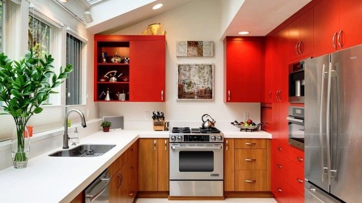 On a white background, furniture in pastel colors always looks good. But bright colors should be used more carefully. It will be enough small details to focus on certain areas and simply dilute the monophonic room. You also need to know that in small kitchens, you should not use more than 2 primary colors. Otherwise, the space will be overloaded and it will be uncomfortable to be in it.