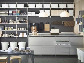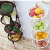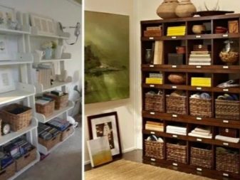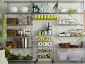 These shelves are equipped with shelves with drawers or baskets. Only the top shelf of furniture can be used as open. Such designs do not make high, otherwise their use will be inconvenient, and such furniture will look massive. In principle, in this design you can store anything. For placement of products it is better to choose boxes with perforations or slots on the surface.