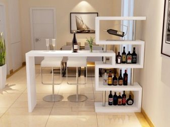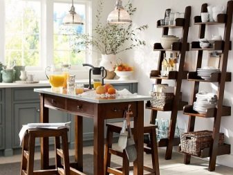 There are models that set themselves to the table and look like its continuation. As a rule, they are the same in height with the table or slightly exceed it. Finally, on sale you can find furniture installed on the kitchen table. Such a bookcase looks like a small slide without walls. It is convenient to hold sweets, a bread box, dishes on it.