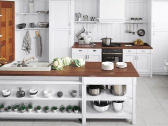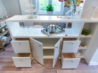 Tall models should not only be functional, but also decorative elements of the interior. They occupy a significant part of the kitchen, so it is recommended to supplement the shelves with elegant dishes, trifles. For more practical use, low designs are suitable. The upper open shelf can be used for a microwave, while the lower closed drawers store everything you need.