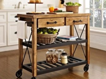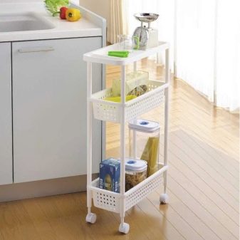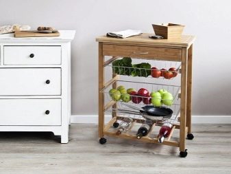 The advantage of the whatnot is its mobility - on sale you can find models of various sizes. Even the smallest section of the kitchen can be turned into a useful one, choosing a suitable whatnot.