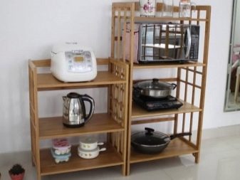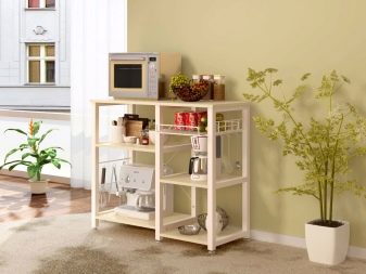 Due to the absence of walls of the whatnot does not take up much space. Moreover, it is very functional: many shelves allow you to place household appliances, dishes on them.You can store both single large items (for example, place them on a microwave shelf), and many small ones, by placing them in special boxes.