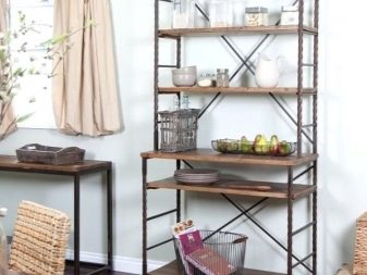 In addition to practicality, one should also take into account how much the bookcase fits into the overall design of the kitchen. For premises in the style of Provence, rustic and ethnic styles, wooden products are suitable. Design - from strict and concise to creative. However, it is better to maintain the “golden mean” - simple-shaped products with decor in the form of carved elements. For country and Provence, you should choose models that combine wood and forged parts.