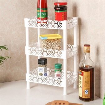 Well-known design, mainly having 4 supports and the required number of shelves. Such whatnots they do not have side walls, everything exposed will be in sight, so you will have to carefully monitor the order. As a rule, such designs are used to a greater extent for decoration. Cans with cereals, beautiful boxes with different small things will be appropriate. Dried flowers, fruit vases will also perfectly complement open shelves and the kitchen as a whole.