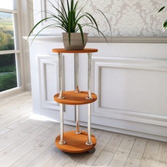For the manufacture of whatnots tempered glass is used. It is characterized by increased strength and even if damaged, it will not crumble into a hundred small fragments. Glass shelves look stylish, allow you to visually expand the room. The material is not afraid of moisture, but splashes or stains become immediately noticeable, because of which it looks messy.