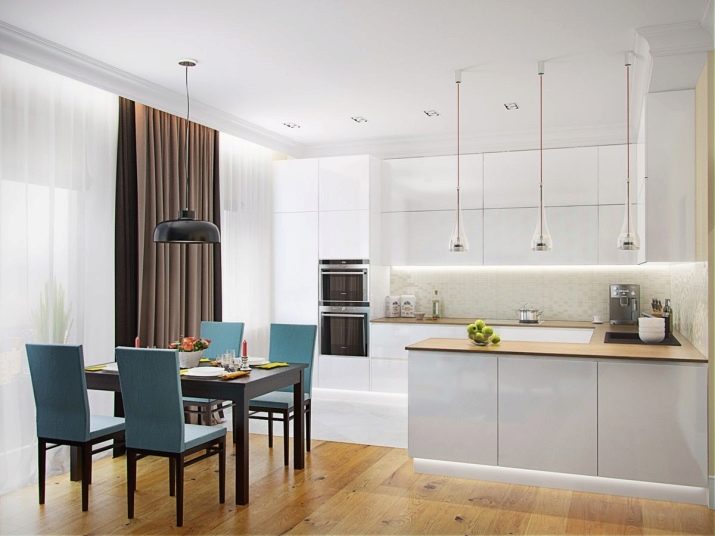 Minimalist style kitchen. In this case, the table is located in the middle of the room, and around it are armchairs selected to match the decor on the windows.