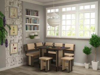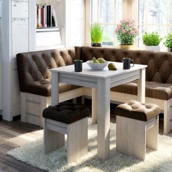 Chairs or stools are often placed near the sofa and table. The design, size, shape or style of the product is selected individually.A variety of materials are used to make a kitchen corner, as well as upholstery materials.
