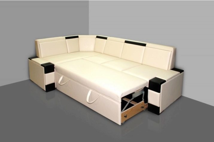 Models for the kitchen are different in structure. Manufacturers produce sofas with provided storage compartments. In compact drawers under the seat, you can fold things that are rarely used.