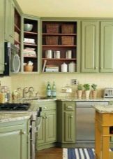 Light oak is often combined with patina, resulting in a kitchen that is vibrant and vibrant.. And also a good look at the combination with the color of dark larch. With this combination of colors in the interior, it is recommended to pay attention to the textiles in the room. So, the sofa here can be made mustard or yellow, if it is assumed that there are chairs, then they can also be with bright upholstery.
