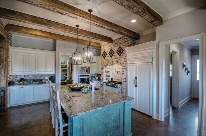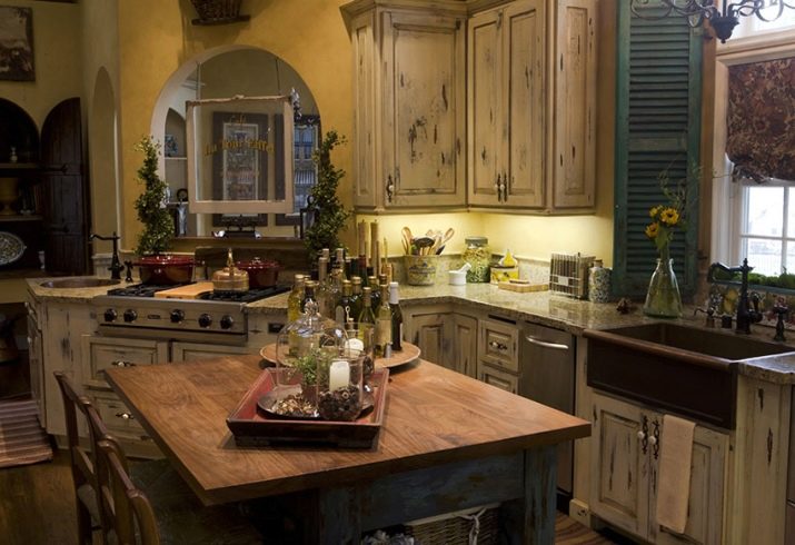 Most often country headsets are located in kitchens with a clear division into zones. At the same time, cabinets and shelves can be made of wood, and glass elements can also be present. But even despite a clear division of functional areas, such a kitchen is always outwardly a single whole with some highlighted details.